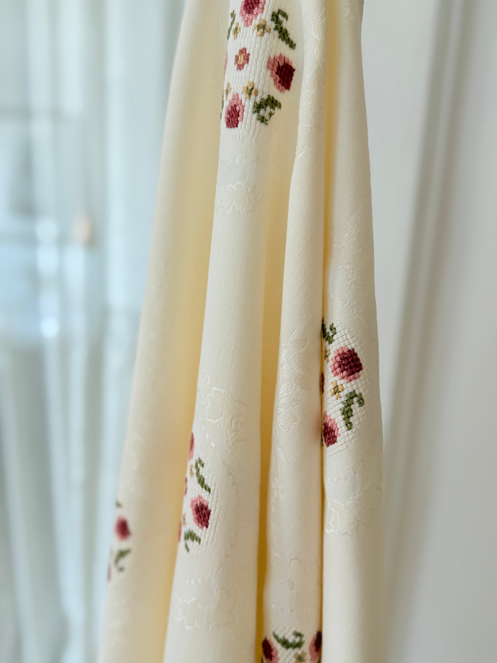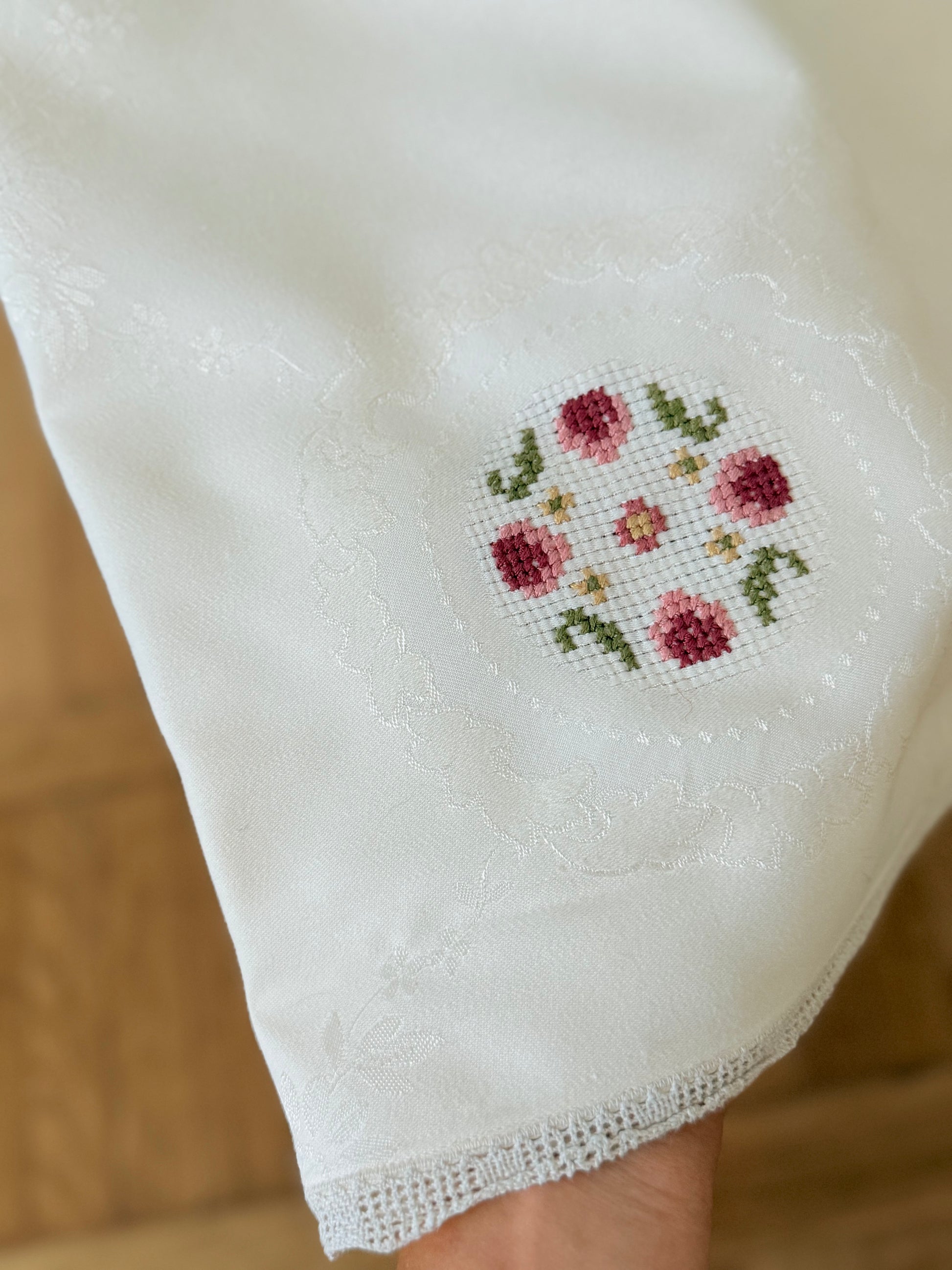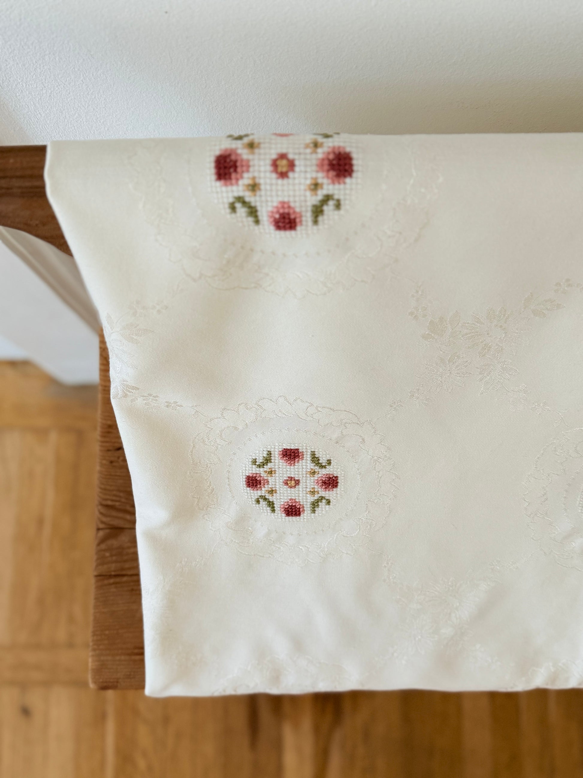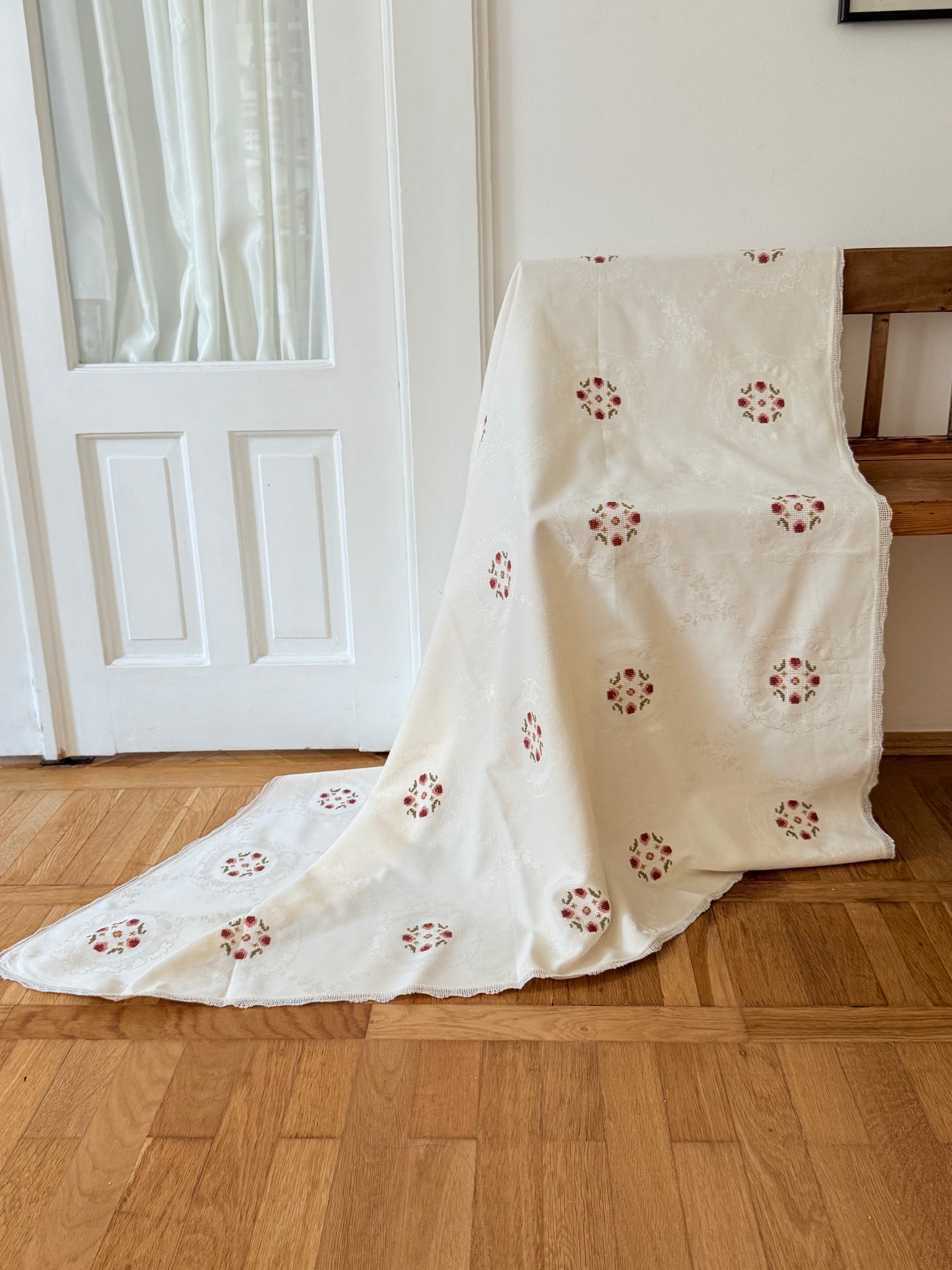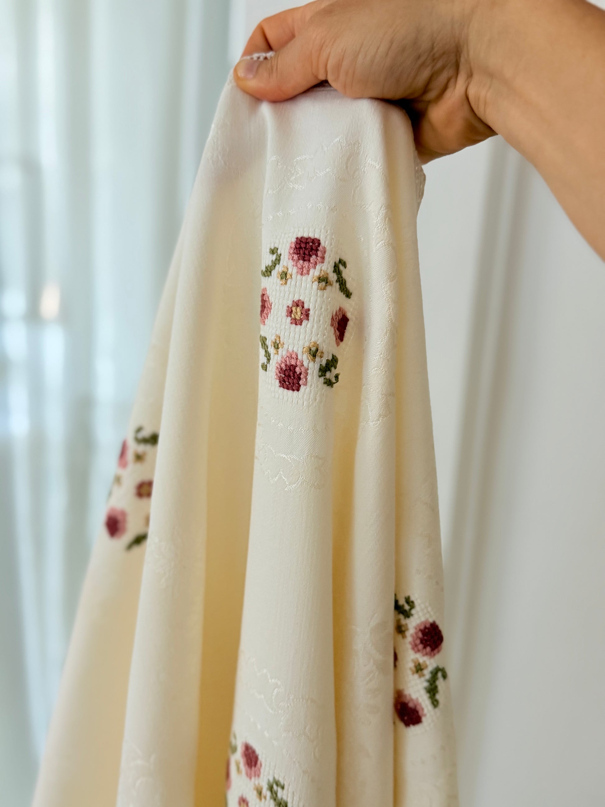 Față de masă bej, brodată cu floricele vișinii și margine dantelată