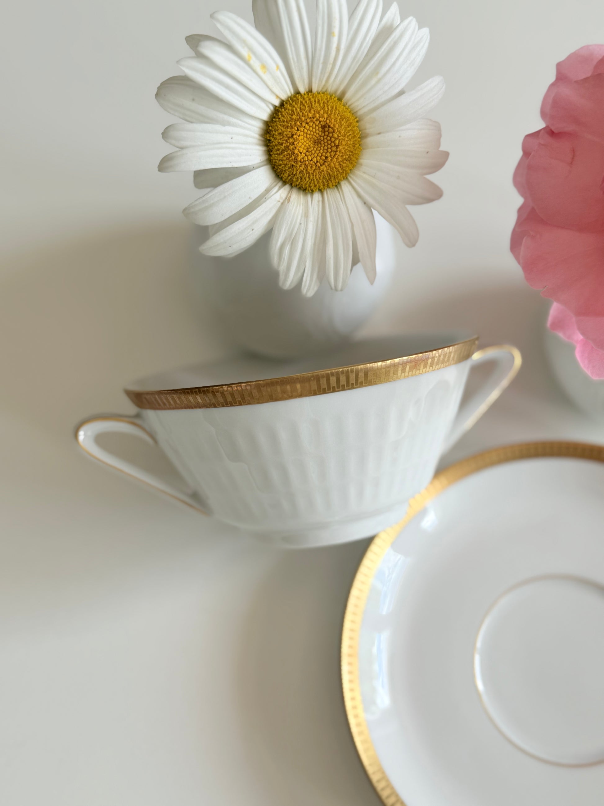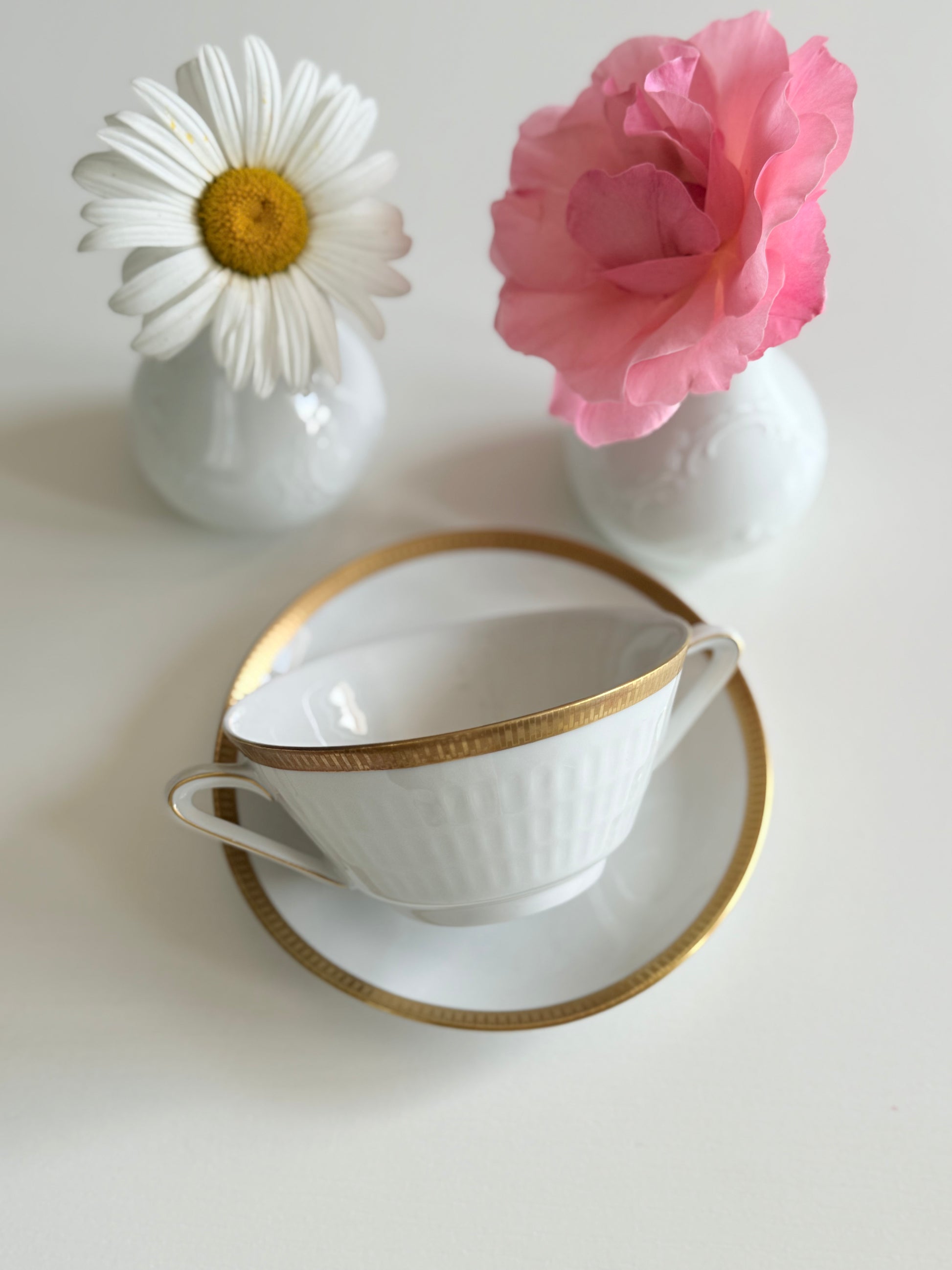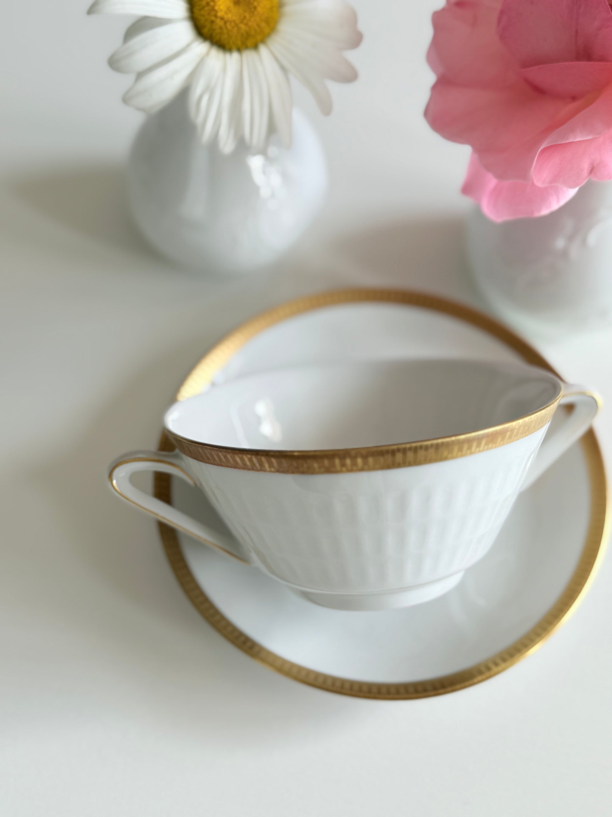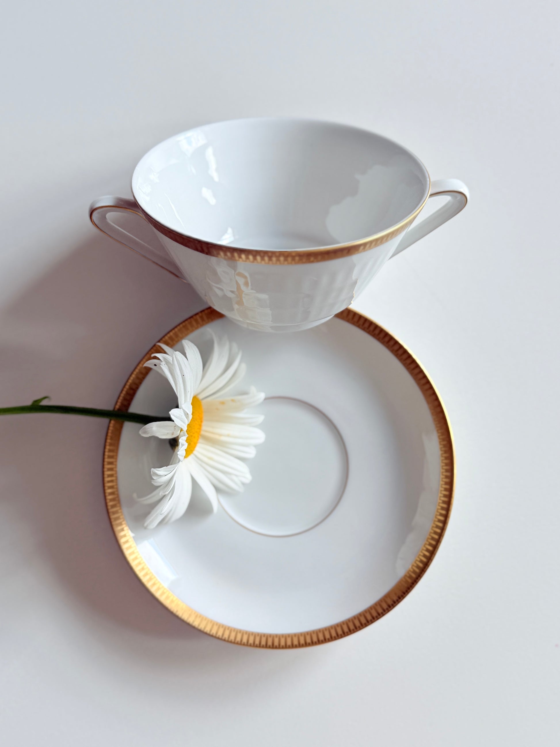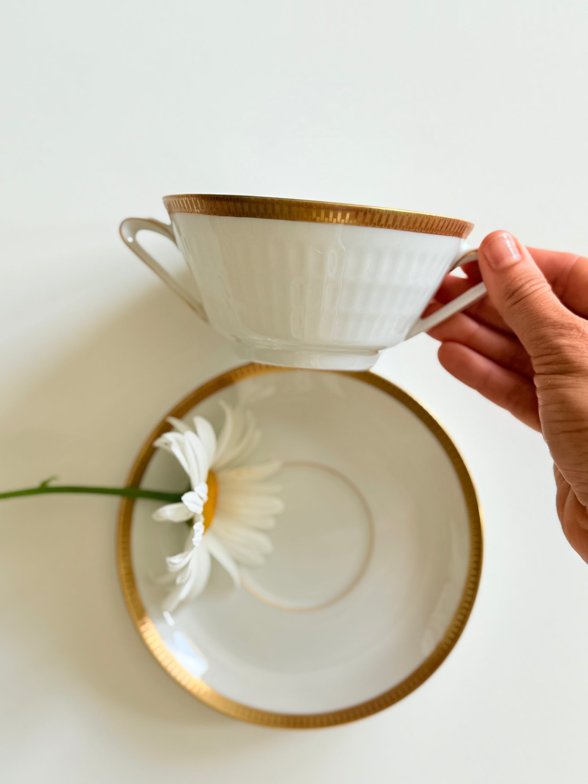 Set ceașcă cu urechi alb cu auriu din porțelan bavarez, model art - deco marca Sherzer