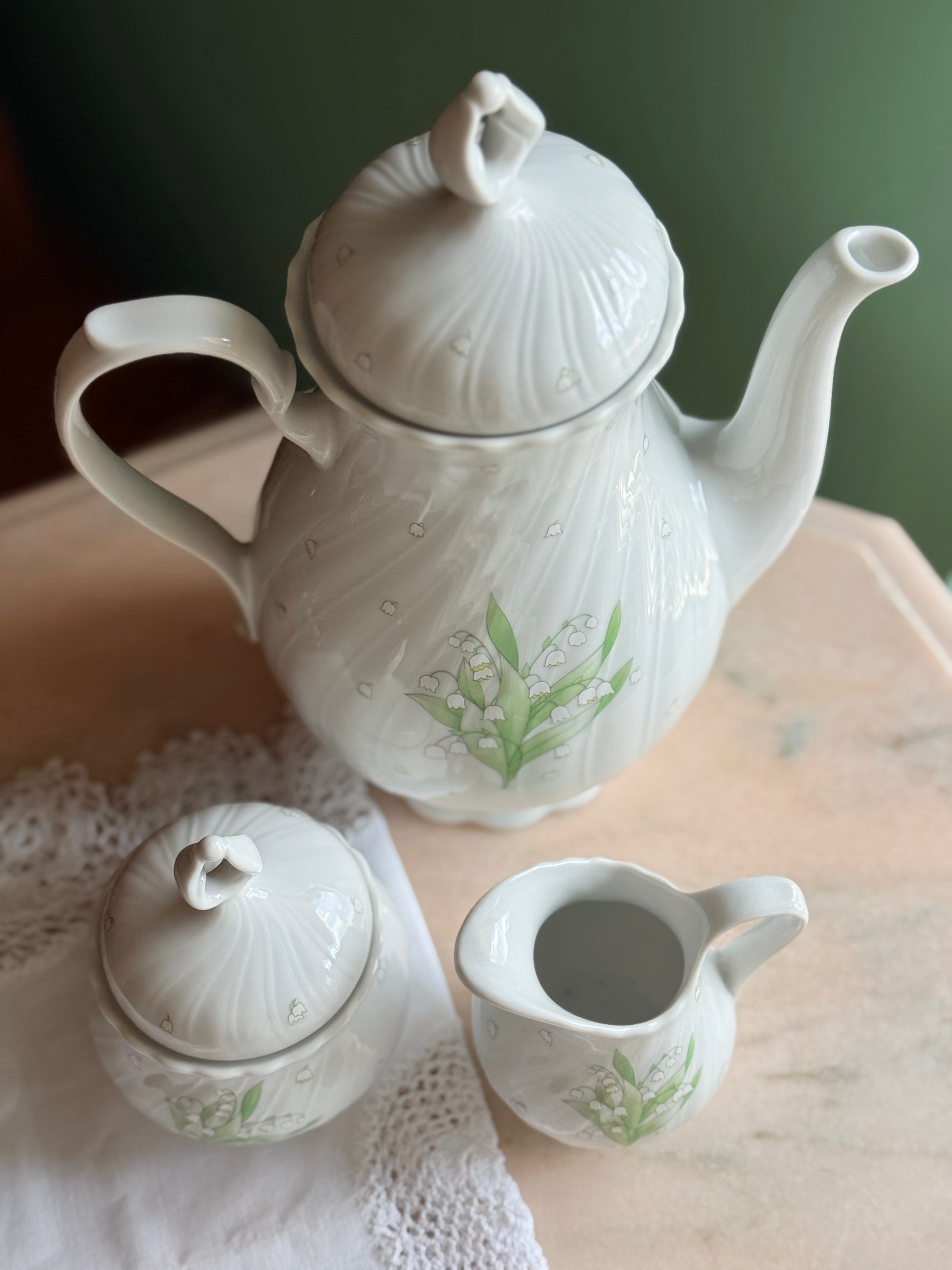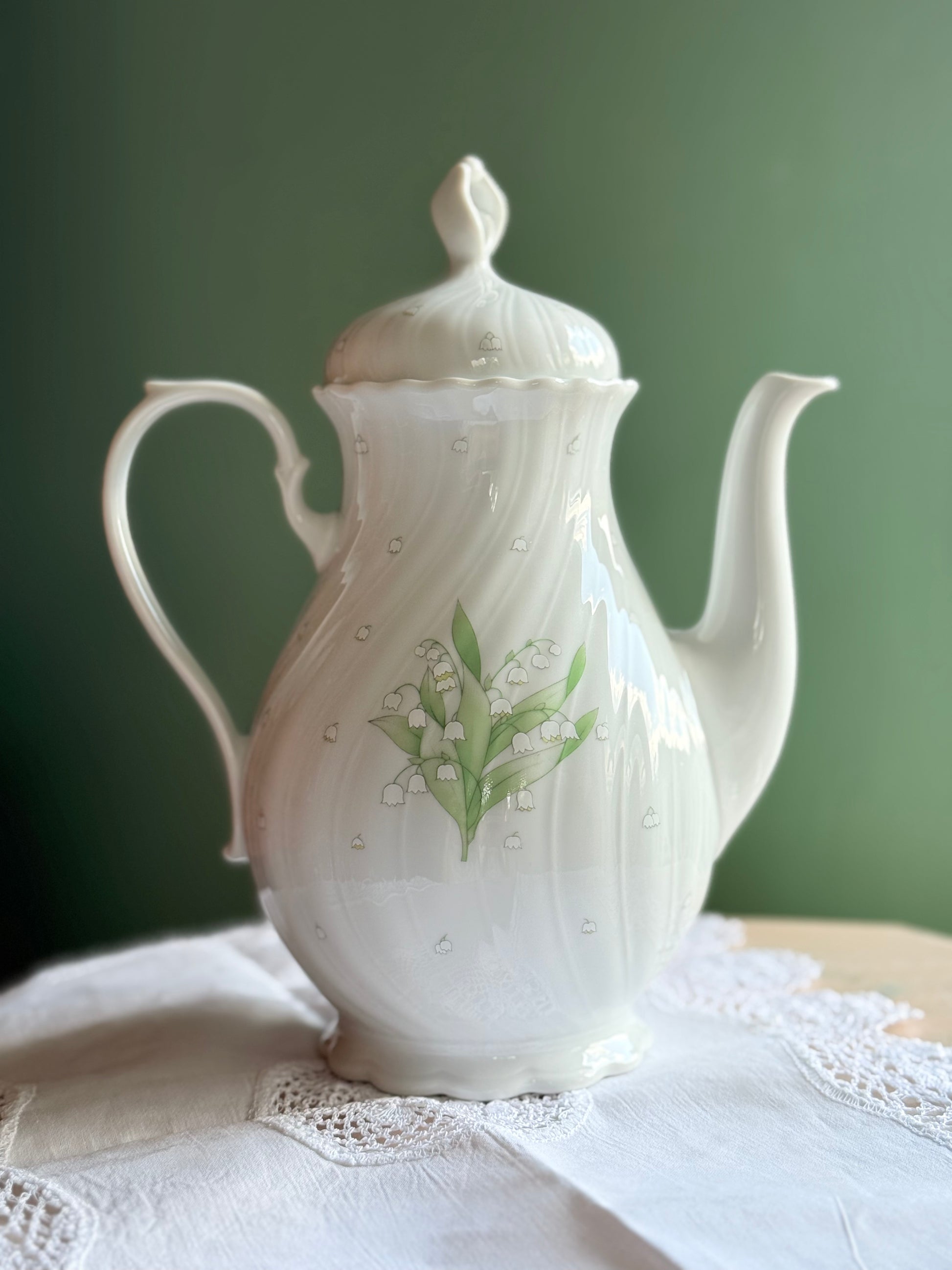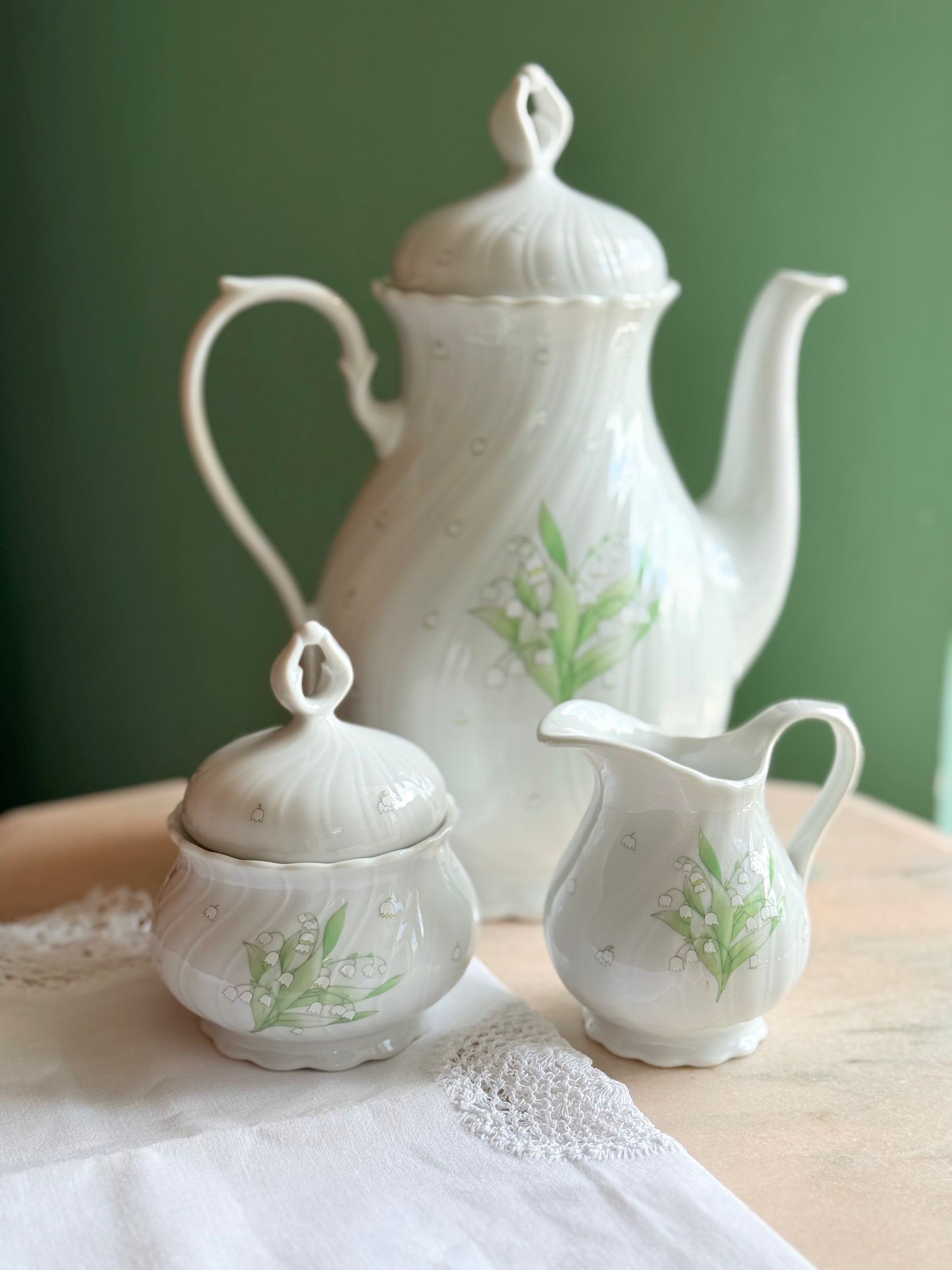 Set pentru servirea ceaiului din porțelan alb cu lăcrămioare, marca Seltmann
