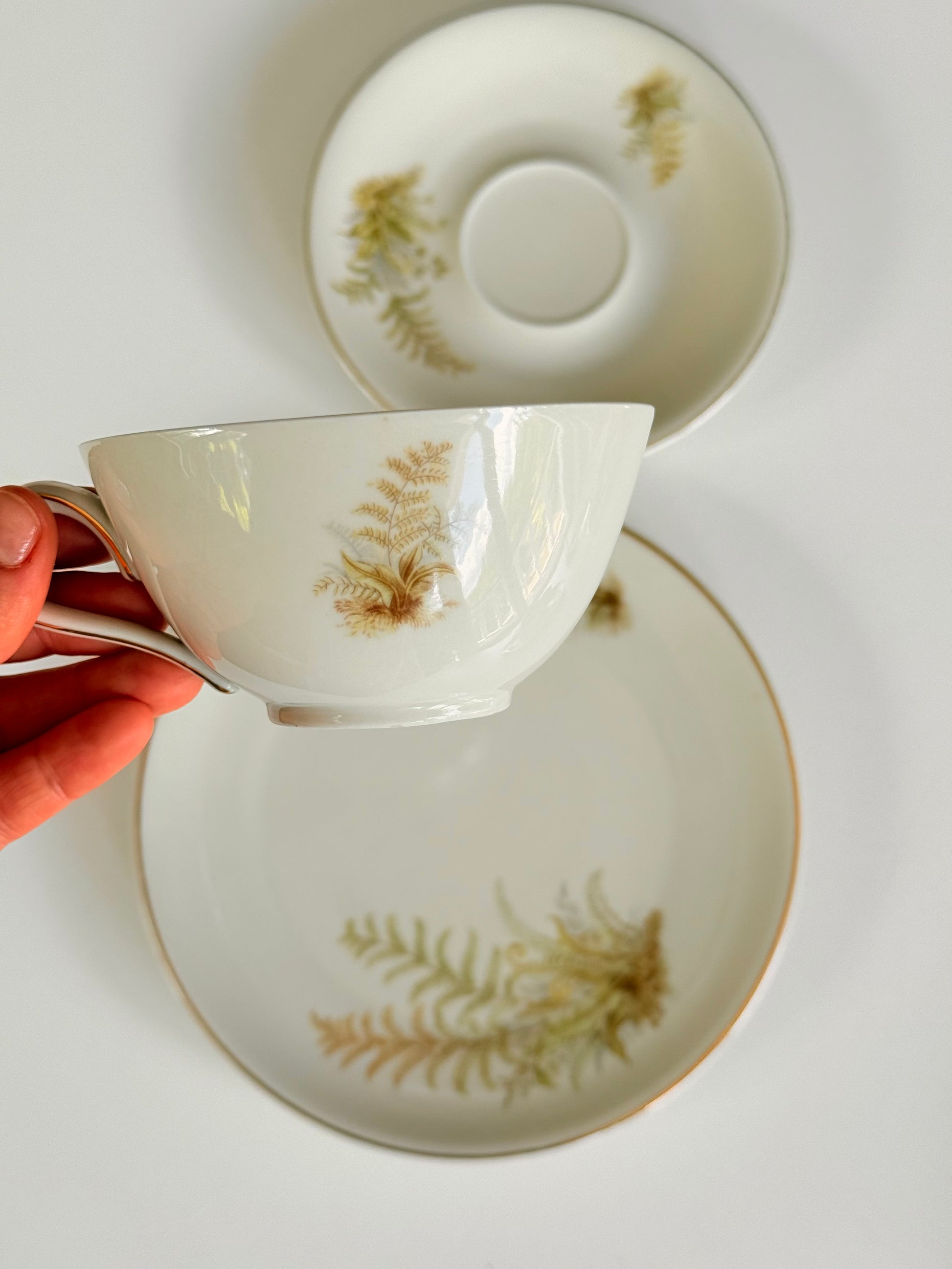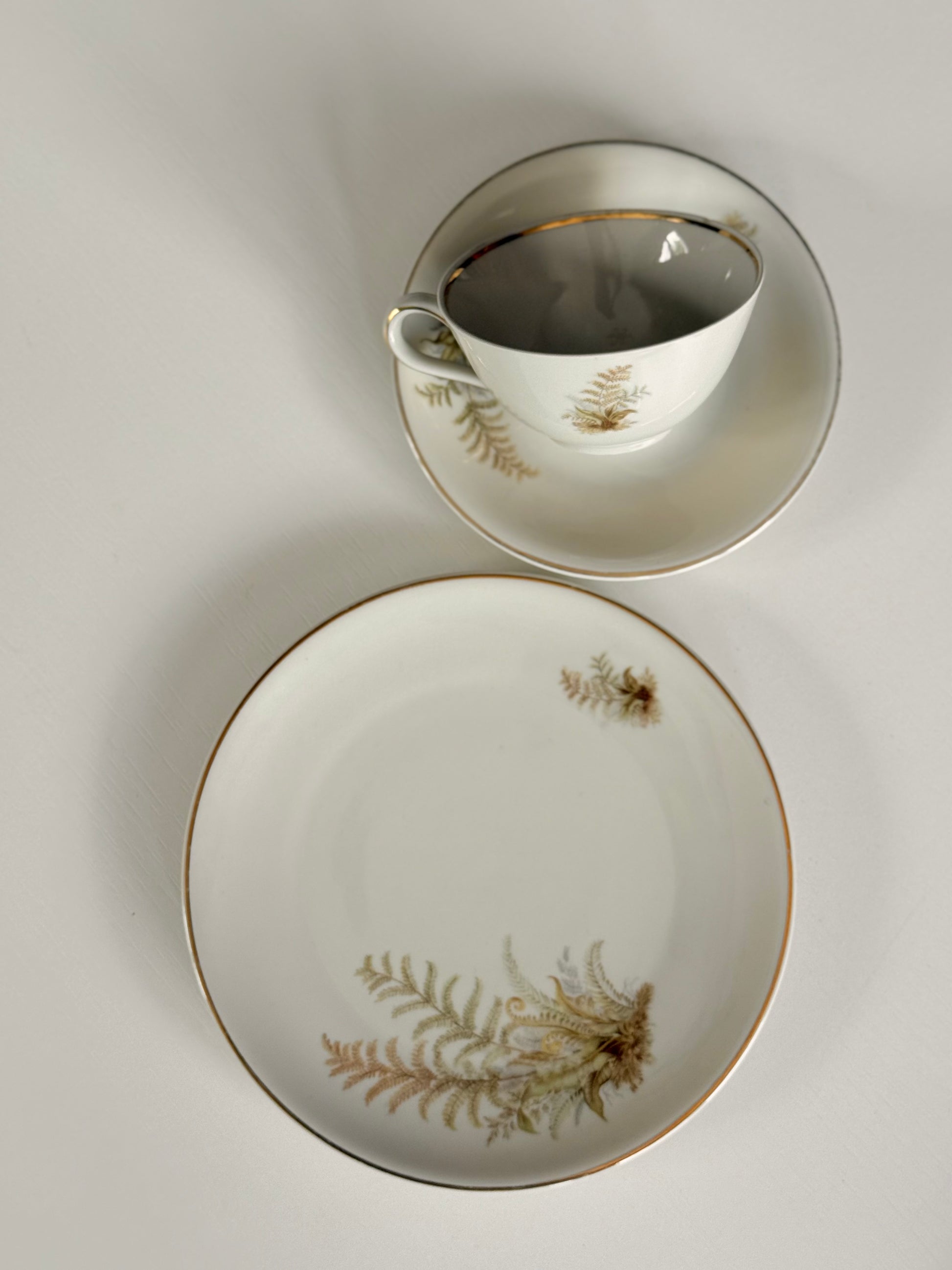 Set mic dejun din porțelan bej cu ferigi și detalii aurii, marca Schriding